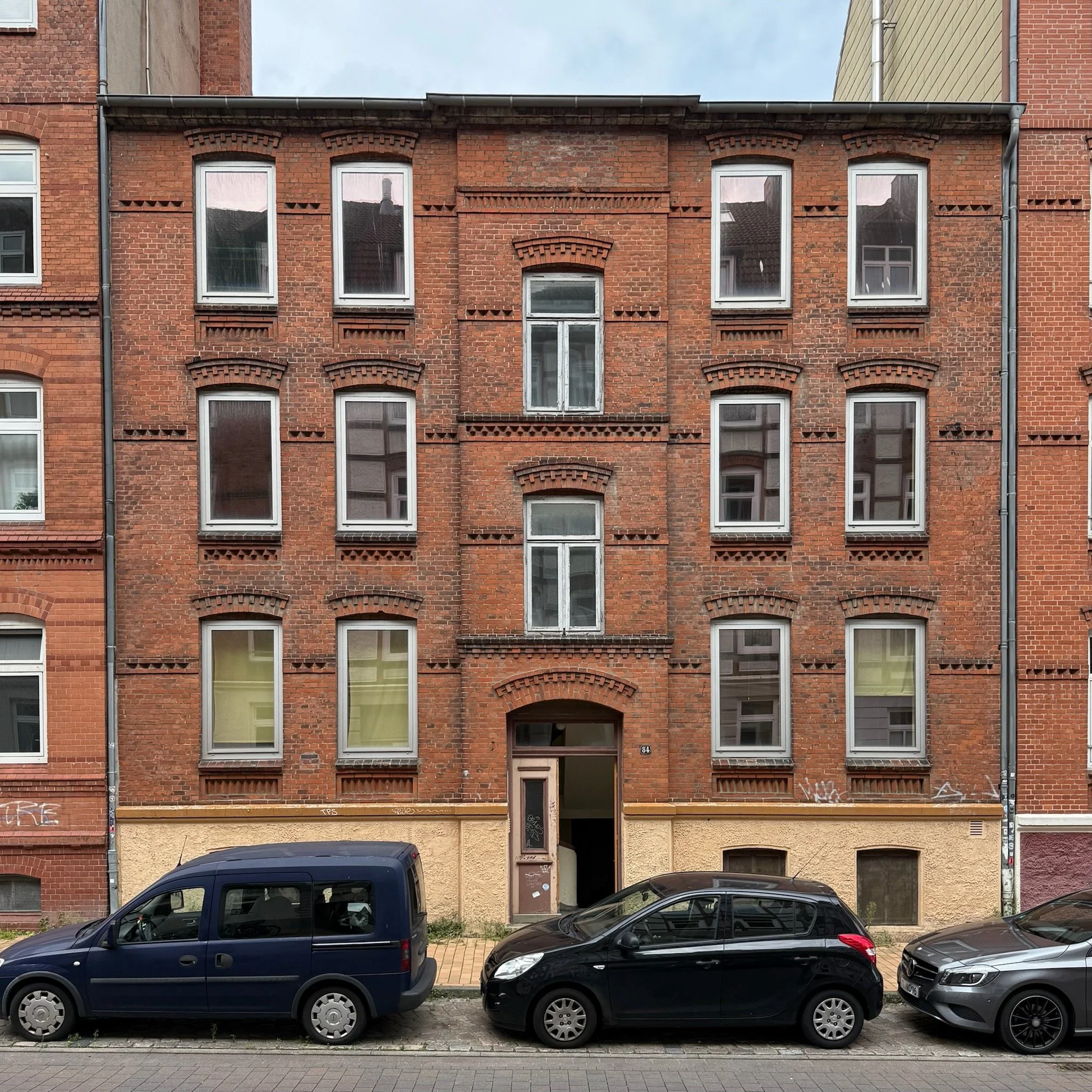 Dieses Foto zeigt die Waitzstraße 84 im heutigen Zustand. Im Vergleich zur ersten Aufnahme ist erkennbar, dass der ursprüngliche Dachstuhl samt Dachgeschoss fehlt: Das Wohnhaus wurde, wie auch die Nachbargebäude, im 2. Weltkrieg vermutlich von Brandbomben getroffen, sodass nur noch Teile (wohl das Mauerwerk) stehen blieben. Wie es scheint, wurden die Häuser nach dem Krieg weitestgehend wieder aufgebaut. Die ursprünglichen Holzbalkendecken wurden durch Betondecken ersetzt, das Treppenhaus mit Beton- statt Holztreppen wieder aufgebaut und wie man sieht, hat man sich den Dachstuhl ganz gespart und lediglich ein Flachdach erstellt. Ende der 1970er wurden zum Teil neue Fenster eingebaut und der Komfort in den Wohnungen durch Zentralheizungen und Duschen in den Küchen erhöht.