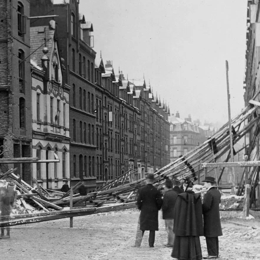 Bei der Recherche zu meinem Projekt in der Waitzstrasse 84 stieß ich im Online-Fotoarchiv des Stadtarchivs Kiel auf dieses spektakuläre Foto aus den frühen 1900er Jahren. Leider ist das Foto nicht genau datiert. Die Aufnahme zeigt die Waitzstraße aus Richtung der Hansastraße zum Knooper Weg. Das Haus Waitzstraße 90 ist während der Bauphase eingestürzt und sorgte zu Recht für große Aufregung. Im Hintergrund erkennt man die drei ähnlichen Häuser Nr. 80, 82 und 84 in ihrem baulichen Urzustand mit jeweils zwei verzierten Giebelgauben.